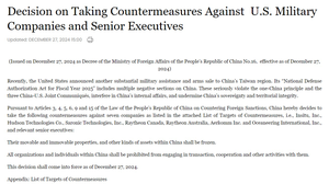 चीन के विदेशी प्रतिबंध विरोधी कानून के अनुच्छेद 3, 4, 5, 6, 9 और 15 के अनुसार, चीन ने इन सात कंपनियों के खिलाफ निम्नलिखित जवाबी प्रतिबंध लगाने का फैसला किया है: इनसिटू कंपनी, हडसन टेक्नोलॉजी कंपनी, सारोनिक टेक्नोलॉजीज कंपनी, रेथियॉन कनाडा कंपनी, रेथियॉन ऑस्ट्रेलिया कंपनी, एलकॉन कंपनी और ओशनियरिंग इंटरनेशनल कंपनी, साथ ही संबंधित वरिष्ठ प्रबंधक चीन के भीतर चल और अचल संपत्तियों और अन्य प्रकार की संपत्तियों को फ्रीज करना।
