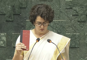 संविधान की प्रति हाथ में लेकर प्रियंका गांधी ने लोकसभा सदस्य के रूप में शपथ ली