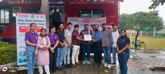 भोपाल : 22 अक्टूबर/ स्कोप ग्लोबल स्किल्स यूनिवर्सिटी में स्टूडेंट वेलफेयर डिपार्टमेंट (डीएसडब्ल्यू), एनएसएस और रेड रिबन क्लब के संयुक्त तत्वावधान में मेगा रक्तदान एवं स्वास्थ्य जांच शिविर का आयोजन किया गया। यह आयोजन देशव्यापी ‘सेवा पखवाड़ा’ के अंतर्गत आयोजित किया गया, जो प्रधानमंत्री श्री नरेंद्र मोदी जी के जन्मदिन के अवसर पर समर्पित था।