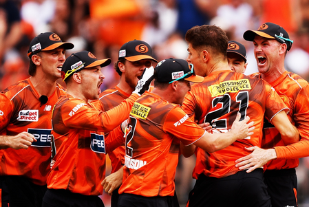इसके जवाब में पर्थ स्कॉर्चर्स ने 17.3 ओवरों में खिताबी मैच अपने नाम कर लिया। इस टीम को मिचेल मार्श और फिन एलन की सलामी जोड़ी ने शानदार शुरुआत दिलाई। दोनों खिलाड़ियों ने 50 गेंदों में 80 रन की साझेदारी की। फिन 22 गेंदों में 1 छक्के और 4 चौकों के साथ 36 रन बनाकर आउट हुए। कुछ देर बाद टीम ने आरोन हार्डी (5) का विकेट भी खो दिया।