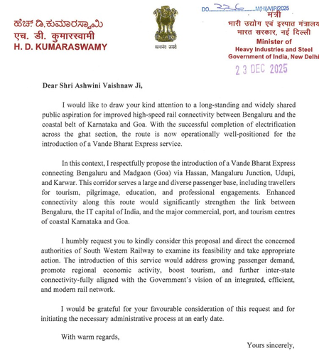 कुमारस्वामी ने पत्र में कहा कि घाट सेक्शन में विद्युतीकरण का काम सफलतापूर्वक पूरा हो चुका है, जिसके बाद यह मार्ग अब वंदे भारत एक्सप्रेस चलाने के लिए पूरी तरह तैयार है। यह ट्रेन पर्यटन, तीर्थयात्रा, शिक्षा और नौकरी संबंधी यात्रा करने वाले लाखों लोगों की सुविधा बढ़ाएगी। इससे भारत की आईटी राजधानी बेंगलुरु और तटीय कर्नाटक तथा गोवा के प्रमुख व्यापारिक, बंदरगाह तथा पर्यटन केंद्रों के बीच संबंध और मजबूत होंगे।