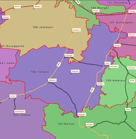 तारापुर विधानसभा क्षेत्र में असरगंज, टेटिहा बम्बर, संग्रामपुर और खड़गपुर ब्लॉक की आठ ग्राम पंचायतें शामिल हैं। 1951 में स्थापित इस क्षेत्र ने 19 बार विधायक चुने हैं, जिनमें दो उपचुनाव शामिल हैं।