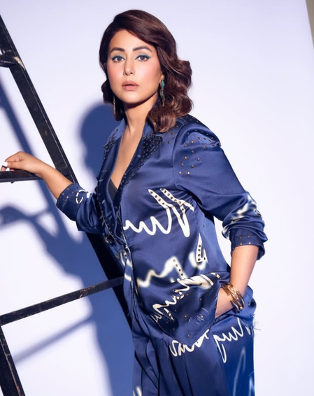 हिना ने इन तस्वीरों में डार्क ब्लू कलर की खूबसूरत ड्रेस पहनी है, जो उनकी पर्सनैलिटी को और निखार रही है। इस लुक को और आकर्षक बनाने के लिए उन्होंने मिनिमल मेकअप के साथ ब्लू शेड का आईलाइनर लगाया हुआ है और बालों को हल्के रोल के साथ स्टाइल किया गया है, जो उनके लुक में चार चांद लगा रहा है। हिना ने इन तस्वीरों को कैप्शन दिया, “विंग इट आउट, ब्लू ग्लैम।”