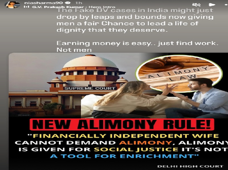 निया शर्मा ने इंस्टा स्टोरी पर दिल्ली हाई कोर्ट का एक फैसला शेयर किया है, जिसमें एक केस में जस्टिस अनिल क्षेत्रपाल और जस्टिस हरीश वैद्यनाथन शंकर की डिवीजन ने फैसला सुनाते हुए कहा कि महिला अगर किसी अच्छे पद पर है और आर्थिक रूप से सक्षम है तो वह गुजारा भत्ते की हकदार नहीं है। कोर्ट ने ये भी कहा कि पहले महिला को ये साबित करना होगा कि वो आर्थिक तौर पर कमजोर है और भरण पोषण की हकदार है।