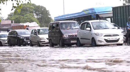यमुना बाजार के रास्तों पर भारी जलजमाव के कारण वाहनों की आवाजाही पूरी तरह ठप हो गई है।