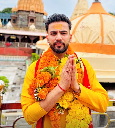 फोटो उज्जैन के प्रसिद्ध महाकाल मंदिर की है, जो शिव भक्तों के लिए एक पवित्र स्थान माना जाता है। तस्वीर में एल्विश पीले रंग की पारंपरिक भारतीय पोशाक में नजर आ रहे हैं, जो उनके पूरे लुक को धार्मिक और शांतिपूर्ण बनाती है। उन्होंने अपने गले में पीले फूलों की माला और माथे पर तिलक लगाया हुआ है। फोटो में वह दोनों हाथ जोड़कर प्रार्थना की मुद्रा में खड़े हैं और बैकग्राउंड में मंदिर और झंडे नजर आ रहे हैं।