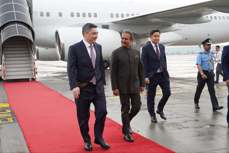 कजाकिस्तान के पीएम ओल्जास बेक्टेनोव का एयरपोर्ट पर विदेश राज्य मंत्री कीर्ति वर्धन सिंह ने स्वागत किया।