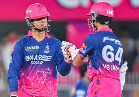 आरआर 84 के स्कोर तक अपने 2 विकेट खो चुकी थी। यहां से जायसवाल ने कप्तान रियान पराग के साथ तीसरे विकेट के लिए 19 गेंदों में 37 रन जुटाए। रियान 10 गेंदों में 3 बाउंड्री के साथ 20 रन बनाकर आउट हुए, जिसके बाद जायसवाल ने शिमरोन हेटमायर के साथ चौथे विकेट के लिए 13 गेंदों में 29 रन की अटूट साझेदारी करते हुए टीम को 150/3 के स्कोर तक पहुंचाया।
