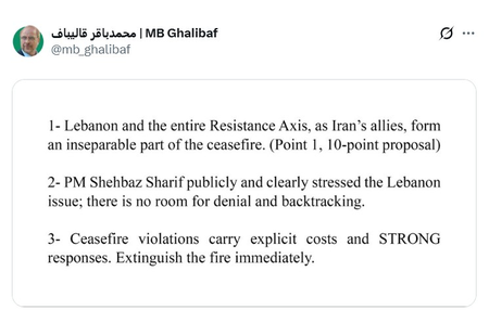 अंग्रेजी में लिखी तीन शर्तों के एक पोस्ट में हुए गालिबाफ ने कहा कि लेबनान, अमेरिका के साथ हुए दो हफ्ते के संघर्ष-विराम का एक अहम हिस्सा था। ईरान के सहयोगी होने के नाते लेबनान और पूरा रेजिस्टेंस ग्रुप इस संघर्ष-विराम का एक अभिन्न अंग हैं। दूसरा पाकिस्तानी पीएम शहबाज शरीफ ने साफतौर पर लेबनान का जिक्र किया था। इससे पीछे हटने का तो सवाल ही नहीं पैदा होता”