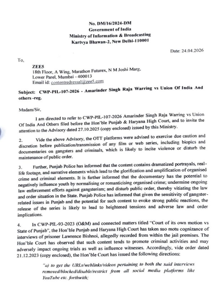चंडीगढ, 24 अप्रैल (आईएएनएस)। केंद्रीय सूचना एवं प्रसारण मंत्रालय ने शुक्रवार को ‘लॉरेंस ऑफ पंजाब’ मामले में ओटीटी प्लेटफॉर्म जी 5 को पत्र लिखा है। पंजाब कांग्रेस के प्रदेश अध्यक्ष अमरिंदर सिंह राजा वारिंग ने अपने सोशल मीडिया एक्स प्लेटफॉर्म पर यह पत्र साझा भी किया है। इस पत्र में ओटीपी प्लेटफॉर्म से इस वेब सीरीज को रिलीज नहीं करने का आदेश दिया गया है।