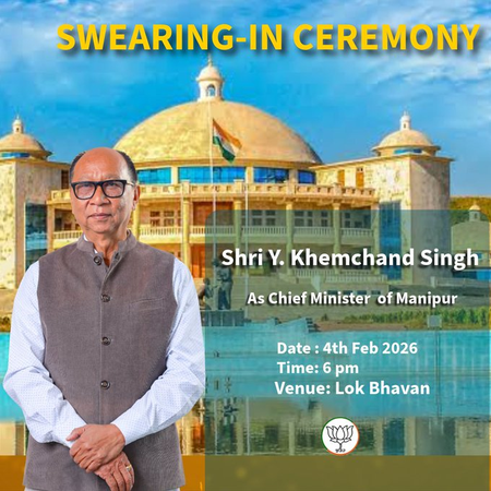 मणिपुर राज्य भाजपा ने सोशल मीडिया प्लेटफॉर्म एक्स पर एक पोस्ट में कहा कि वाई खेमचंद सिंह का मणिपुर के मुख्यमंत्री के रूप में शपथ ग्रहण समारोह आज, 4 फरवरी 2026 को शाम 6:00 बजे लोक भवन में होगा।