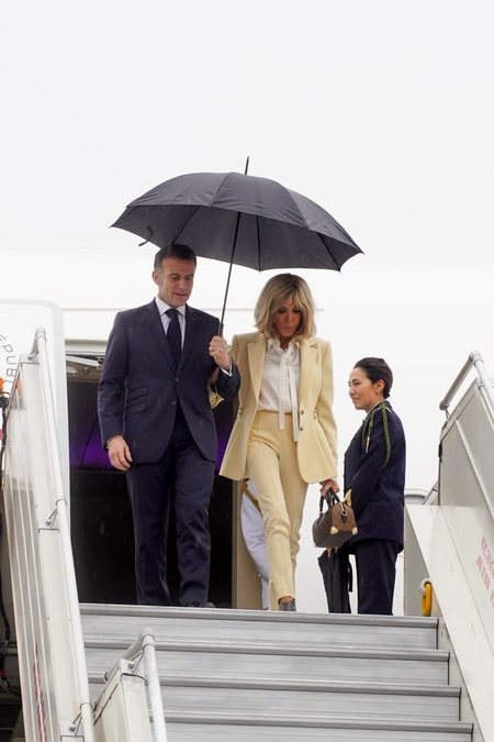 नई दिल्ली, 18 फरवरी (आईएएनएस)। फ्रांस के राष्ट्रपति इमैनुएल मैक्रों बुधवार को फर्स्ट लेडी ब्रिजिट मैक्रों के साथ नई दिल्ली पहुंचे। हवाई अड्डे पर उनका एमओएस केवी सिंह ने स्वागत किया, और रिमझिम बरसात के बीच लोक कलाकारों की प्रस्तुति का मैक्रों ने हाथ जोड़कर धन्यवाद दिया।