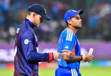 भारत ने पावरप्ले के खेल तक 1 विकेट गंवाकर 86 रन बनाए, जो टी20 वर्ल्ड कप में किसी टीम का चौथा सबसे बड़ा था। वेस्टइंडीज ने साल 2024 में अफगानिस्तान के खिलाफ शुरुआती 6 ओवरों में 1 विकेट खोकर 92 रन बनाए थे, जबकि नीदरलैंड ने साल 2014 में आयरलैंड के खिलाफ 91/1 का स्कोर बनाया था। इंग्लैंड की टीम साल 2016 में साउथ अफ्रीका के विरुद्ध 3 विकेट खोकर 89 रन बना चुकी है।
