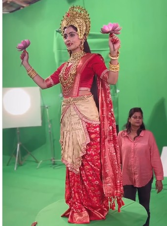 वीडियो में युक्ति दोनों हाथों में कमल का फूल लिए गोल-गोल घूमती हुई दिखाई दे रही हैं, जिससे उनका यह अवतार और भी दिव्य लग रहा है।