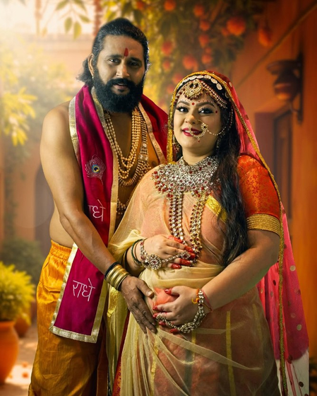 लाल चूड़ियां, भारी गहने, माथे पर बिंदी और नथ उनके लुक को बिल्कुल पारंपरिक मां की छवि में ढाल रहे हैं। वहीं, यश कुमार भी पारंपरिक वेशभूषा में नजर आ रहे हैं। उन्होंने केसरिया रंग की धोती पहनी है और गले में मोतियों की माला के साथ कंधे पर ‘राधे-राधे’ लिखा हुआ दुपट्टा डाला हुआ है। इस तस्वीर में दोनों बेहद प्यार के साथ पोज दे रहे हैं।
