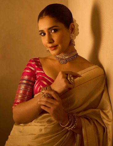 राशि ने खूबसूरत साड़ी पहनी है, जिसका चौड़ा गोल्डन बॉर्डर उनके लुक को और निखार रहा है। इस साड़ी के साथ उन्होंने गहरे गुलाबी रंग का ब्लाउज चुना, जिस पर गोल्डन लाइन और बाजुओं पर बारीक कढ़ाई की गई है। उनके गहनों की बात करें तो उन्होंने गले में नाजुक नेकलेस, कानों में चमकदार झुमके और हाथों में गोल्डन कंगन पहने हैं, जो उनके लुक को और भी शाही बना रहे हैं। मिनिमल मेकअप के साथ राशि ने सादगी भरा जूड़ा बनाया, जिसमें साइड में सफेद फूलों की गजरा उनकी सुंदरता को चार चांद लगा रही है।