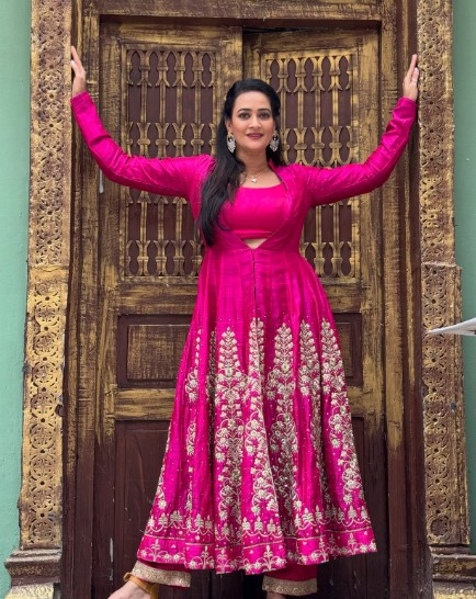 इंस्टाग्राम पर पोस्ट की गई तस्वीरों में जसवीर ने रानी रंग का अनारकली सूट पहना है, जो उनकी खूबसूरती को और निखार रहा है। इस सूट में बारीक कढ़ाई का काम किया गया है, खासकर स्कर्ट के घेर वाले हिस्से पर, जो इसे बेहद खास बना रहा है। लंबे बाजू वाला टॉप गले में स्टाइलिश डिजाइन सबका ध्यान खींच रहा है, जिसमें एक छोटा सा कट-आउट है। स्कर्ट पर फूल-पत्तियों की नाजुक कढ़ाई हल्के सुनहरे और चांदी जैसे धागों से की गई है, जो सूट को शाही अंदाज दे रही है।