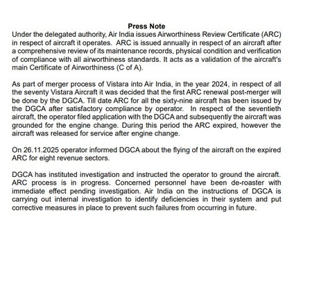 26 नवंबर 2025 को एयर इंडिया ने खुद डीजीसीए को सूचना दी कि उनका यह विमान बिना वैध एआरसी के 8 यात्री उड़ानें पूरी कर चुका है। सूचना मिलते ही डीजीसीए ने तुरंत जांच शुरू कर दी और संबंधित विमान को तत्काल प्रभाव से जमीन पर खड़ा करने का आदेश दिया। अभी नया एआरसी जारी करने की प्रक्रिया चल रही है।