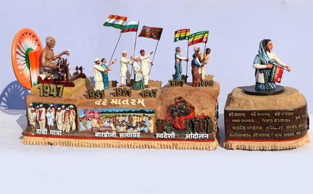 वहीं, वर्ष 1921 में बेजवाड़ा (अब विजयवाड़ा) में युवा क्रांतिवीर पिंगली वेंकैया ने एक नई डिजाइन का ध्वज बनाया और उसे गांधी जी को दिखाया। 1931 में पिंगली द्वारा तैयार किए गए ध्वज को लगभग स्वीकृति दे दी गई, जो तीन रंगों का बना था और उसके केंद्र में चरखा था। अंततः 22 जुलाई, 1947 को भारतीय संविधान सभा ने झंडे के केंद्र में चरखे की जगह धर्म चक्र के साथ तिरंगे को इसके वर्तमान स्वरूप में स्वीकार किया। वर्तमान राष्ट्रीय ध्वज की इस निर्माण यात्रा के साथ भारत की आजादी के महत्वपूर्ण आंदोलनों का भी इस झांकी में निदर्शन किया गया।
