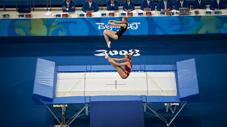 ओलंपिक में ट्रैम्पोलिन का आकार 5.05 मीटर लंबा और 2.91 मीटर चौड़ा होता है। इसकी ऊंचाई करीब 1.155 मीटर होती है। ट्रैम्पोलिन का बेड सिंथेटिक से निर्मित होता है, जिसमें इतनी लचक होती है कि एथलीट्स 8 मीटर तक हवा में उछल सकते हैं।