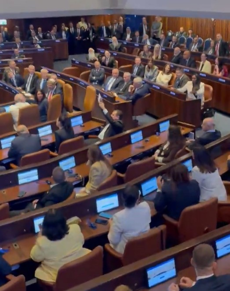 इस पूरे कार्यक्रम के लाइव टेलीकास्ट में हंगामा होता दिखा। द टाइम्स ऑफ इजरायल ने बताया कि हदाश-ताअल पार्टी के अध्यक्ष अयमान ओदेह को केसेट की पूर्ण बैठक से हटा दिया गया, क्योंकि उन्होंने अमेरिकी राष्ट्रपति डोनाल्ड ट्रंप के भाषण के दौरान “फिलिस्तीन को मान्यता देने” का आह्वान करने वाली एक तख्ती दिखाई।